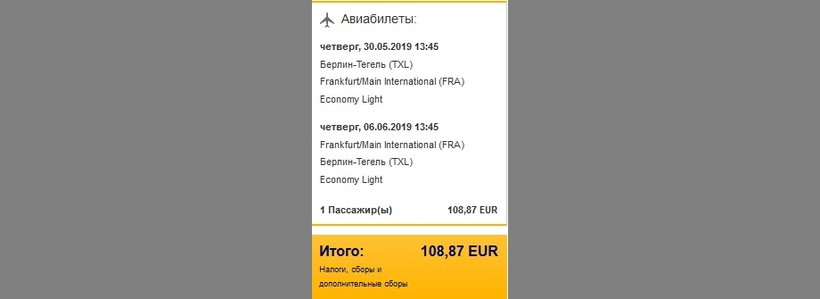 Билеты (туда и обратно) на рейс Lufthansa стоят 108 €.