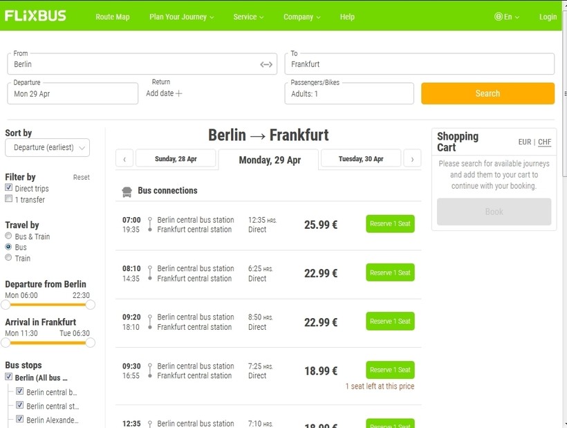 Автобусы немецкого перевозчика Flixbus совершают в день 8 рейсов из Берлина во Франкфурт-на-Майне.