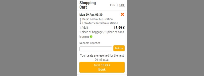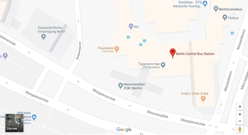 В кассе фирмы Flixbus. В Берлине касса находится по адресу Messedamm, 2–4, во Франкфурте-на-Майне — Stuttgarter Strasse, 26.