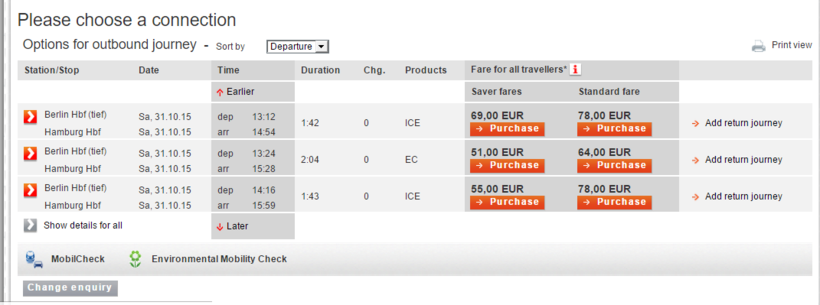 Видим, что поезда отправляются от станции Berlin Hbf, прибывают в Hamburg Hbf. Hbf - означает Центральный вокзал. Так что, отправитесь Вы с центрального вокзала города, и приедете тоже на центральный вокзал. Время в пути от 1 часа 43 минут до 1 часа 57 минут. В эконом классе поезда билет будет стоить 41 – 55 евро, а в высшем классе 78 евро. Но я не вижу смысла переплачивать. Вы в пути даже два часа не пробудете, а поезда в Германии отремонтированные, чистые и комфортабельные во всех классах.