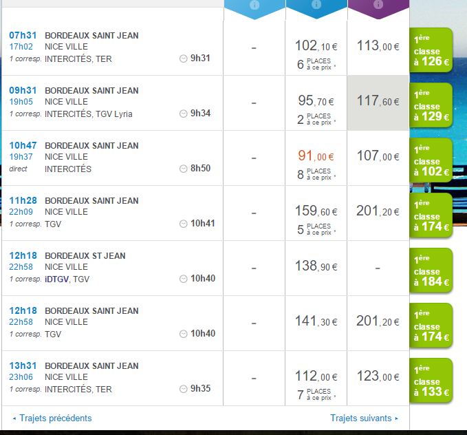 В 10 часов 43 минуты от вокзала BORDEAUX ST JEAN отправляется поезд на вокзал NICE VILLE. Прибывает он в Ниццу в 19 часов 37 минут. Время в пути 8 часов 54 минуты. Выполняет рейс поезд INTERCITES.