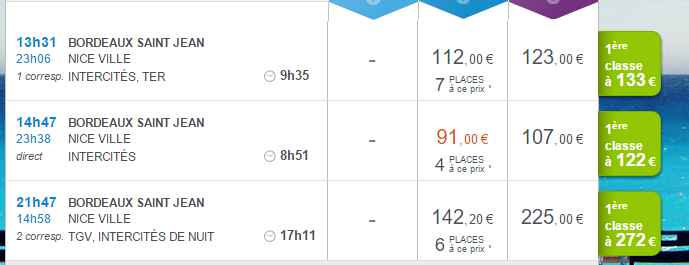 SNCF – национальное общество железнодорожных дорог Франции, обеспечит Вас комфортным путешествием в Ниццу. SNCF имеет широкую сеть железных дорог, и направление Бордо-Ницца входит в их число. Поезда в Ниццу с железнодорожного вокзала отправляются около 10 раз в день. Есть рейсы с пересадками и прямые. Поговорим про прямой рейс.