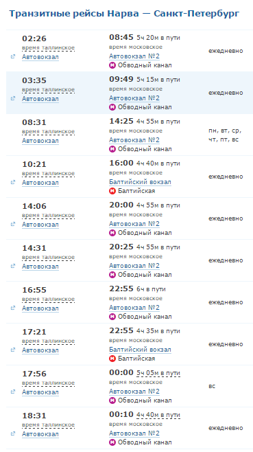 Прямых рейсов «Нарва – Санкт-Петербург» нет. Однако есть транзитные рейсы, которые заезжают на нарвский автовокзал.