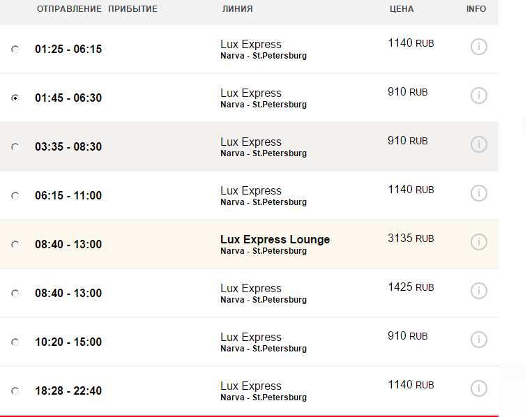 Можно проехать в Санкт-Петербург с компанией Lux Express. В среднем автобусы совершают 8 рейсов в сутки. Вот расписание с их сайта: