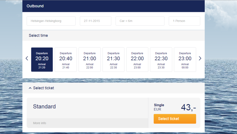 Цена за билет составляет 43 евро. Как видим, цена почти идентична цене за проезд по мосту на машине. Билеты можно забронировать на сайте http://www.scandlines.com/ заполнив вот такую форму и выбрав время поездки: