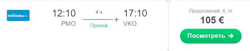 На данный момент, прямой рейс из Палермо в Москву есть только по четвергам и воскресеньям. Его выполняет авиакомпания Pobeda. В небе нужно провести 4 часа.