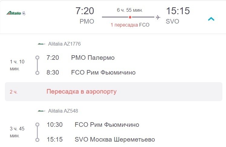 Вернусь к перелету из Палермо в Москву. В остальные дни (кроме четверга и воскресенья) вы можете добраться до столицы РФ с пересадкой. Ее можно сделать, например, в Риме. Гражданские авиаперевозки по этому маршруту выполняет компания Alitalia.