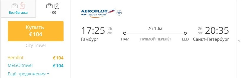 Проездные документы на самолет до Санкт-Петербурга от 104 евро (от 7600 рублей).