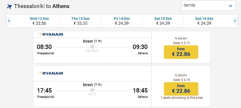 Ниже приведена информация о том, сколько часов вам потребуется, чтобы добраться от Салоников до Афин, а также приведена примерная стоимость проезда (средняя цена билета) на том или ином виде транспорта.