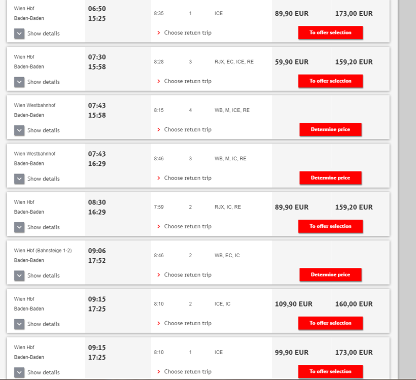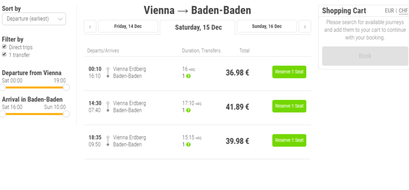 Ниже приведена информация о том, сколько часов вам потребуется, чтобы добраться от Вены до Баден-Бадена, а также приведена примерная стоимость проезда (средняя цена билета) на том или ином виде транспорта.