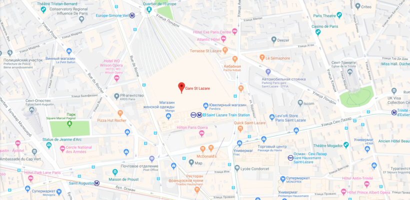 Saint Lazare Train Station находится недалеко от центра города, можно пройти пешком за минут двадцать или проехаться на метро, поездка займет примерно 10 минут.