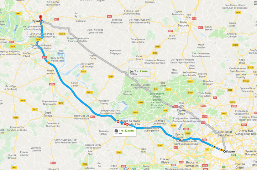 Расстояние между Парижем и Руаном примерно 130 км, поездка займет чуть меньше двух часов. Дороги по-европейски качественные, хорошее покрытие, нет ям. По пути можете встретить несколько придорожных ресторанчиков, можно остановиться перекусить. Также на маршруте Париж – Руан есть достаточное количество автозаправочных станций.