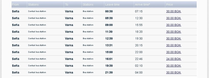 График движения можно посмотреть на сайтах вышеупомянутых перевозчиков или на автостанции Софии. Кстати, именно оттуда и отправляются автобусы в Варну.