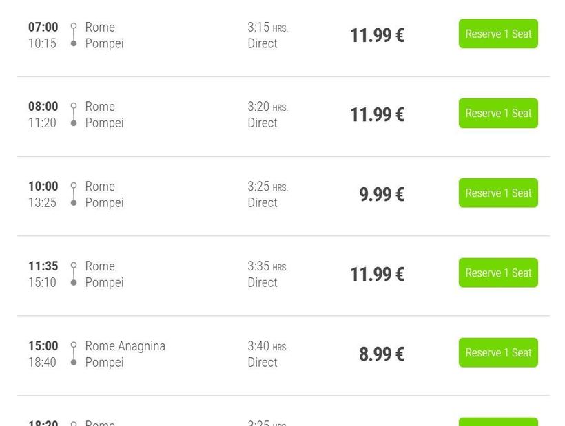 Ниже приведена информация о том, сколько часов вам потребуется, чтобы добраться от Рима до Помпей, а также приведена примерная стоимость проезда (средняя цена билета) на том или ином виде транспорта.