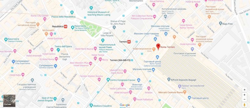 Как видно, рейсов без пересадок нет вообще. Придется как минимум 1 раз пересаживаться в Неаполе, что уже само по себе не слишком-то удобно. Можно не ехать все время поездами Trenitalia, а лишь добраться ими до Неаполя, а там пересесть на поезд местной региональной компании. Раньше она называлась Circumvesuviana, теперь же это часть компании E. A. V. Не вижу никакого смысла делать лишнюю пересадку, и к тому же платить за это дополнительные деньги, ведь поездом ехать еще и дороже. Кроме того, так получится нисколько не быстрее, так как даже если путь до Неаполя преодолеть на Intercity, то до Помпей придется ехать в обычной электричке. Впрочем, желающие испытать на себе все недостатки данного варианта могут отправляться на римский вокзал Termini, располагающийся тут: