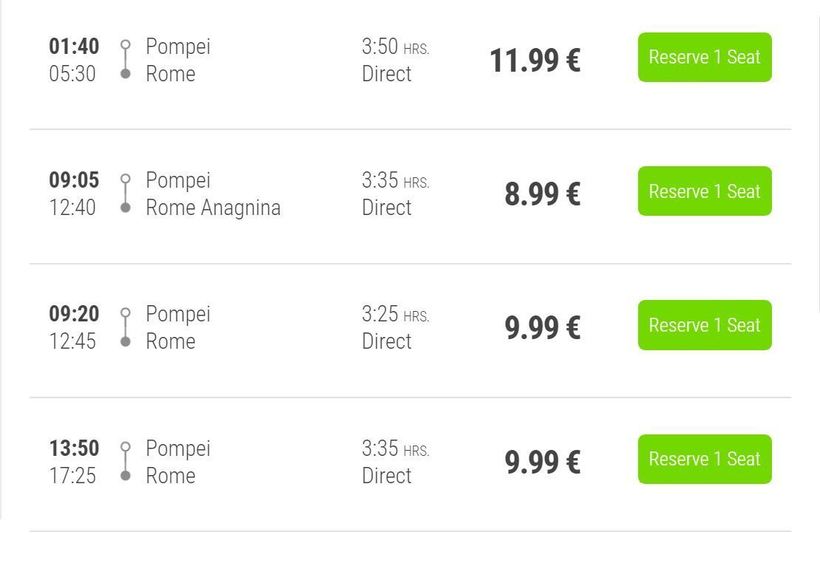 Ниже приведена информация о том, сколько часов вам потребуется, чтобы добраться от Помпей до Рима, а также приведена примерная стоимость проезда (средняя цена билета) на том или ином виде транспорта.