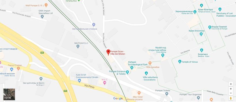 Железнодорожная станция в Помпеях тоже есть, она расположена на юго-западе от автовокзала, на приведенной мной карте её хорошо видно. Также есть еще одна железнодорожная станция, называется она Pompei Scavi, находится она вот здесь: