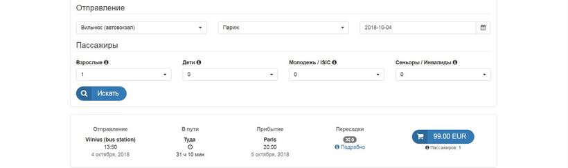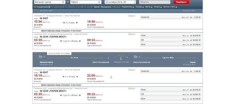 К сожалению, прямого поезда от Вильнюса до Парижа нет. Но всё же, хоть и с одной пересадкой, доехать можно. Сначала нужно будет добраться из Вильнюса в Минск, а уже потом сесть на поезд, проходящий через Минск и следующий в Париж. Поезд такой есть, он принадлежит РЖД и идет поздней ночью, поэтому можно добраться до Минска либо дневным, либо вечерним поездом. Приведу для наглядности скриншот с сайта РЖД: