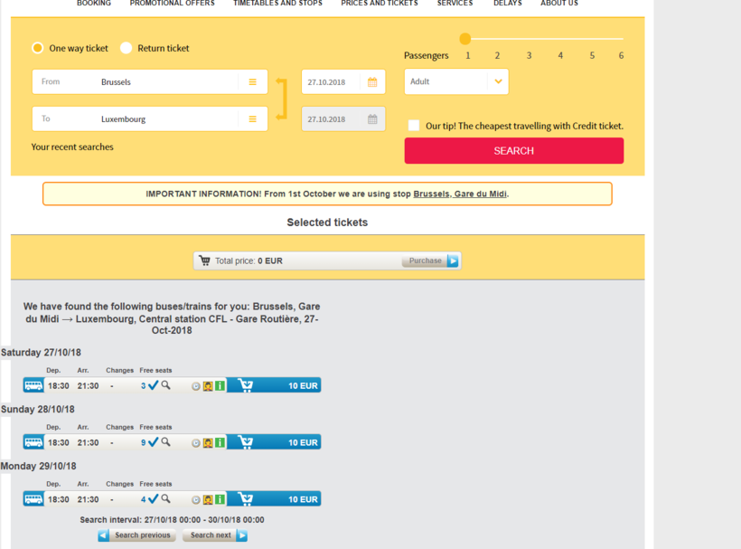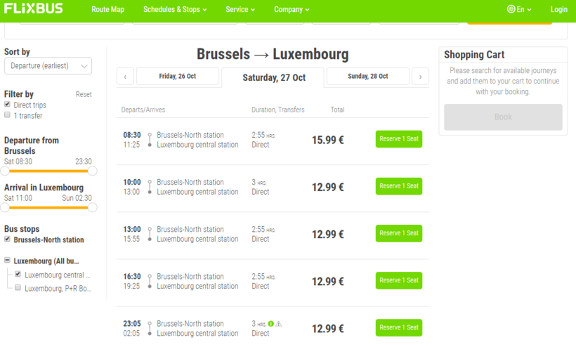 RegioJet выполняют рейс Брюссель – Люксембург регулярно один раз в день в 18:30. Время в пути три часа. Вот расписание на субботу – понедельник.
