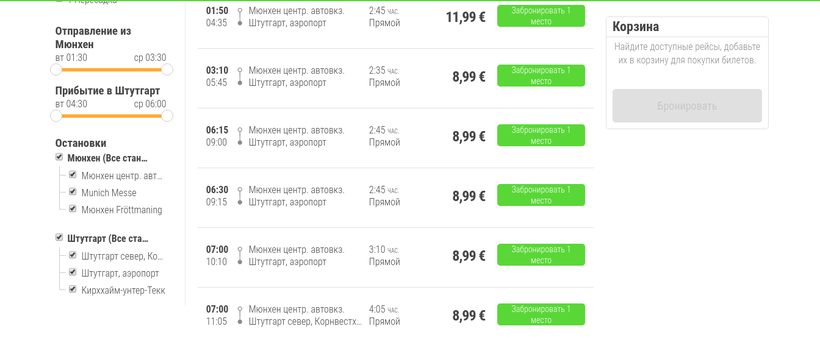 Это лишь часть полного списка, рейсов намного больше, поэтому рекомендую зайти на сайт компании и уточнить расписание на интересующую дату. Основная часть рейсов отправляется с центрального автовокзала Мюнхена, который располагается вот тут: Прибывают рейсы в основном на автостанцию вблизи аэропорта Штутгарта: