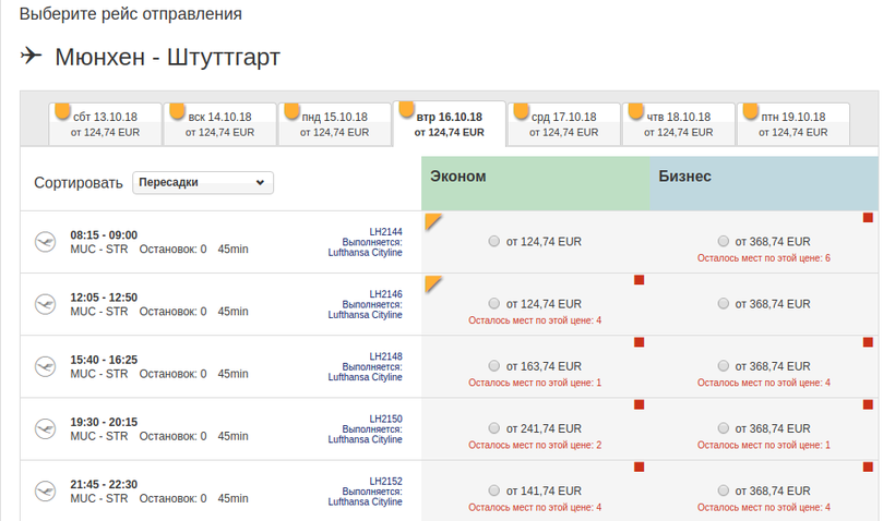 Вопреки информации разных сайтов, прямые рейсы из Мюнхена в Штутгарт есть только у одной авиакомпании. Это лидер немецкого (да и только немецкого) авиарынка Lufthansa. Приведу скриншот с сайта компании на случайную дату:
