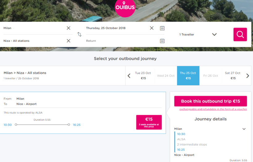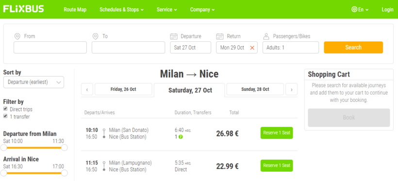 Маршрут Милан — Ницца обслуживают два международных автобусных перевозчика: