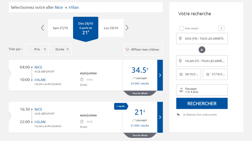 Ниже приведена информация о том, сколько часов вам потребуется, чтобы добраться от Ниццы до Милана, а также приведена примерная стоимость проезда (средняя цена билета) на том или ином виде транспорта.