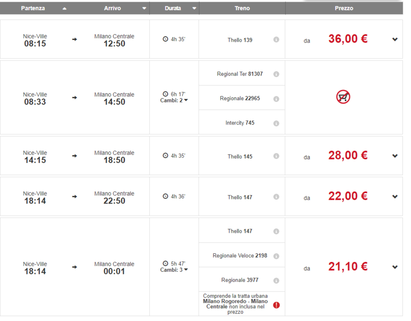 На маршруте Милан — Ницца только один ж/д оператор — итальянская компания TrenItalia. Вам нужен будет вот такой поезд, который называется Thello: