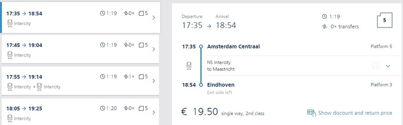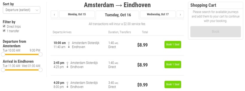 Ниже приведена информация о том, сколько часов вам потребуется, чтобы добраться от Амстердама до Эйндховна, а также приведена примерная стоимость проезда (средняя цена билета) на том или ином виде транспорта.