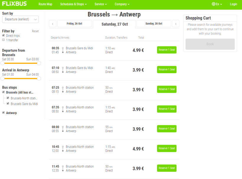 Автобусы Flixbus ходят регулярно несколько раз в день. Первый автобус уходит в 00:35, а последний отправляется в 20:30. Обратите внимание, что некоторые автобусы в пути 1:10–1:40, обязательно учтите это, когда будете покупать билет. Вот часть расписания на субботний день: