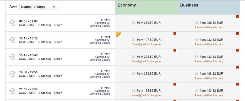 Прямые авиарейсы из Мюнхена в Дрезден предлагает только одна авиакомпания — Lufthansa. Вся информация из интернета о том, что якобы есть прямые авиарейсы и других компаний не соответствует действительности. Воспользоваться рейсами KLM, Eurowings и прочих, конечно же, можно, но придётся лететь с пересадками, а это вряд ли удобно. Итак, приведу скриншот расписания Lufthansa с официального сайта: