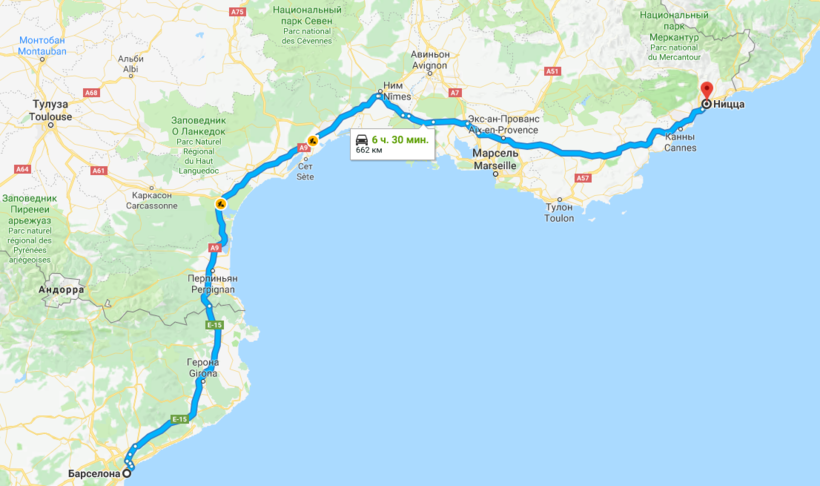 Отличный вариант для тех, кто путешествует группой! Расстояние между Барселоной и Ниццей 660 км, время в пути примерно чуть больше шести часов. Покрытие дорог очень хорошее, АЗС много. Верхнее ограничение скорости на автомагистралях 120 км/ч в Испании и 130 км/ч во Франции.