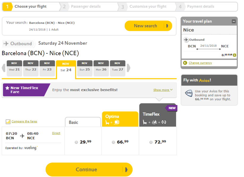 - Итак, Vueling из Барселоны в Ниццу летает только один раз в день и каждый день в разное время. Давайте я покажу вам пример расписания на субботний день:
