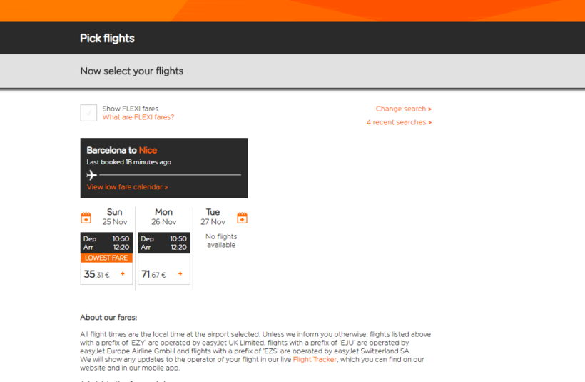 - EasyJet также выполняет прямой рейс Барселона - Ницца, однако они летают не каждый день, уточняйте информацию заранее. Вот пример расписания на выходной и будний день: