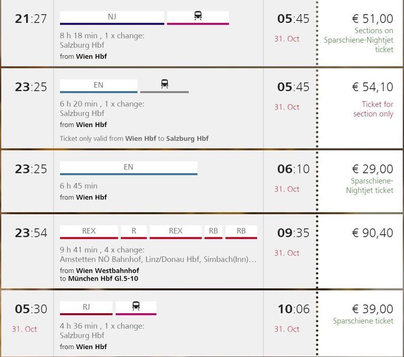 Можно воспользоваться и железнодорожным транспортом. Благо, поездов в Европе ничуть не меньше, чем автобусов, и поэтому данный вид транспорта очень распространен. Предлагаю зайти на сайт австрийских железных дорог и там уточнить расписание на интересующую дату. Я же приведу для иллюстрации скриншот на произвольную дату:
