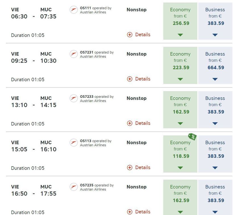 Прямые рейсы из Вены в Мюнхен предлагает авиакомпания Austrian. Вот скриншот расписания с её сайта:
