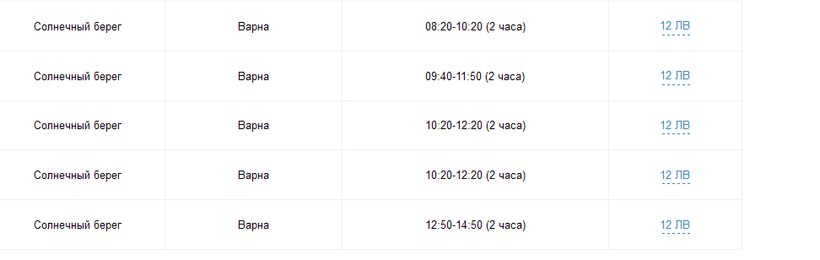 Ниже приведена информация о том, сколько часов вам потребуется, чтобы добраться от Солнечного Берега до Варны, а также приведена примерная стоимость проезда (средняя цена билета) на том или ином виде транспорта.