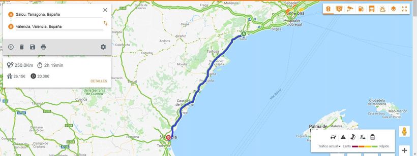 В Испании есть платные и бесплатные автотрассы. В данном случае я могу порекомендовать воспользоваться бесплатными дорогами, потому что поездка по платным, согласно сайта испанских автодорог, вылетит в копеечку (почти 50 евро без мелочи):