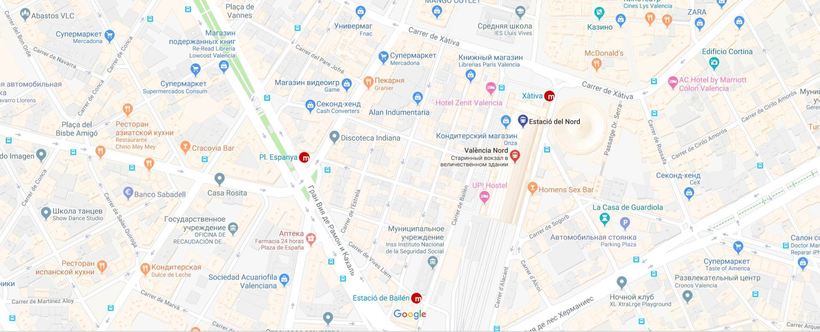 Неоспоримым преимуществом поезда является еще и скорость движения – в Валенсии можно быть уже через 2 часа с небольшим. Прибывают все поезда на вокзал Nord, который находится вот тут: