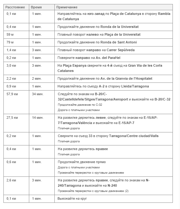 Расстояние между Барселоной и Таррагоной составляет всего 100 километров. Поэтому, если у вас есть личный автомобиль, или вы взяли его в аренду, смело отправляйтесь в Таррагону. Доедете вы до Таррагоны всего за час. Ехать нужно по автомагистрали С-32. Автомагистраль новая и имеет великолепную инфраструктуру: несколько полос для движения в разных направлениях, разделительную полосу, все необходимые дорожные знаки, разметку, которая дублирует некоторые из этих знаков, а также есть места для разворота и транспортные развязки. Ниже вы сможете увидеть скрин, на нем я специально разработала маршрут из Барселоны в Таррагону, на тот случай если в вашем автомобиле не будет навигатора или карты: