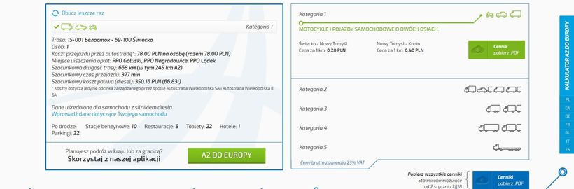 Стоимость проезда по платной трассе в Польше составляет 78 злотых (примерно 19 евро), вот скриншот с сайта польской автострады А2: