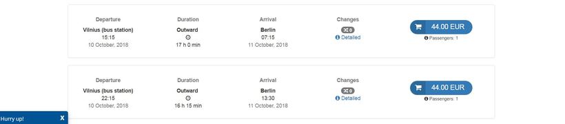Ниже приведена информация о том, сколько часов вам потребуется, чтобы добраться от Вильнюса до Берлина, а также приведена примерная стоимость проезда (средняя цена билета) на том или ином виде транспорта.