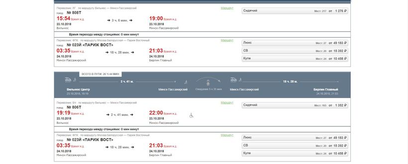 Добраться поездом тоже можно, но есть лишь два варианта, на котором придется делать 1 пересадку, в основном же пересадок будет 2 или больше. В самом лучшем случае нужно сесть на поезд до Минска, а там пересесть на поезд до Берлина. В обоих случаях придется от Минска до Берлина ехать на поезде РЖД, а потому стоит обратиться на их сайт, откуда я сделаю скриншот на произвольную дату: