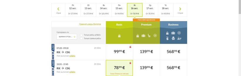 Прямые авиарейсы от Риги до Парижа осуществляет авиакомпания AirBaltic. Вот скриншот с её официального сайта: