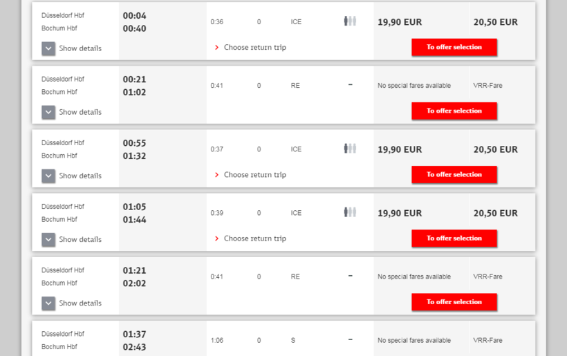 Прямых рейсов множество, поэтому уехать в Бохум на поезде можно круглосуточно. Поезда отправляются примерно каждые 10–40 минут.