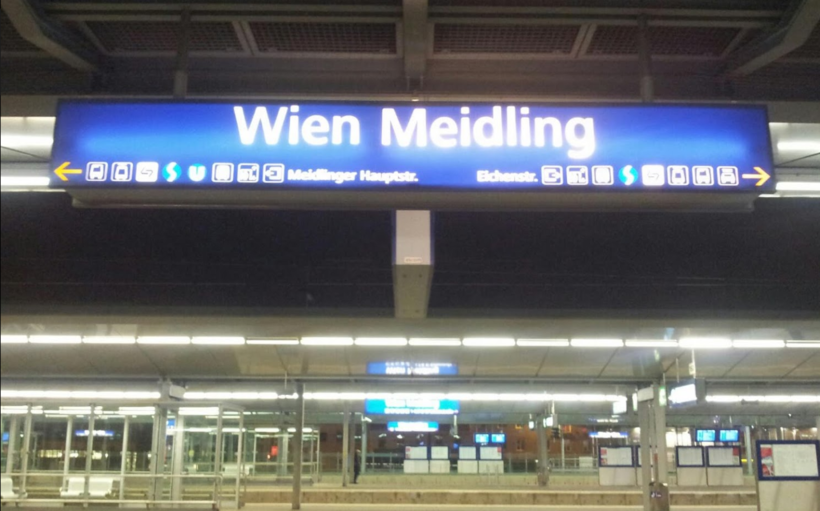 Отправляются поезда со станции Wien Meidling, - Ж/Д ю́жный вокзал. Адрес вокзала: Eichenstraße 25, 1120 Wien.