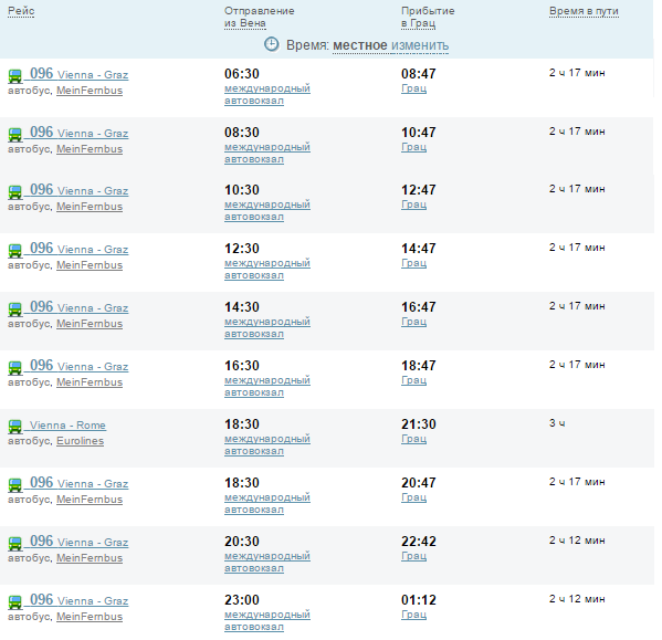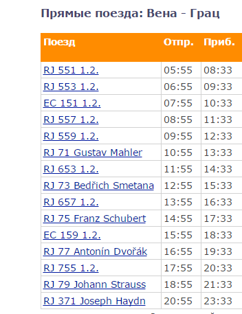 Начиная с 5 часов 55 минут утра и до 20 часов 55 минут вечера, поезда с Вены в Грац ездят каждый час. Так что, Вашему выбору времени, когда выезжать из Вены, может позавидовать любой турист.