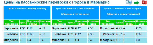 Если Вы планируете в тот же день вернуться с Мармариса в Родос, то билеты могут стоить дешевле: для взрослого итоговая сума: 50 евро, а для ребенка – 30 евро.