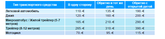 Также компания перевозчик обеспечит Вам переправу Вашего транспорта: легкового автомобиля, джипа, мотоцикла и даже трейлера. Цена на перевозку легкового автомобиля в одну сторону составляет 110 евро, а туда и обратно – 130 евро.