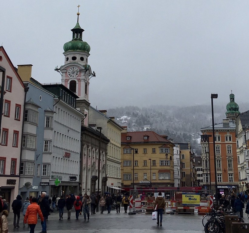 Снег в Инсбруке явление редкое. Даже если метель придет, и город укроется белым покрывалом, все довольно быстро растает. Полюбоваться заснеженными пейзажами шансов немного. Днем температура держалась около 0, ночью опускалась до –4. Довольно ветрено, капюшон зимой в Австрии — вещь незаменимая. Дни пролетали незаметно, светало в восемь, темнело в половину пятого.